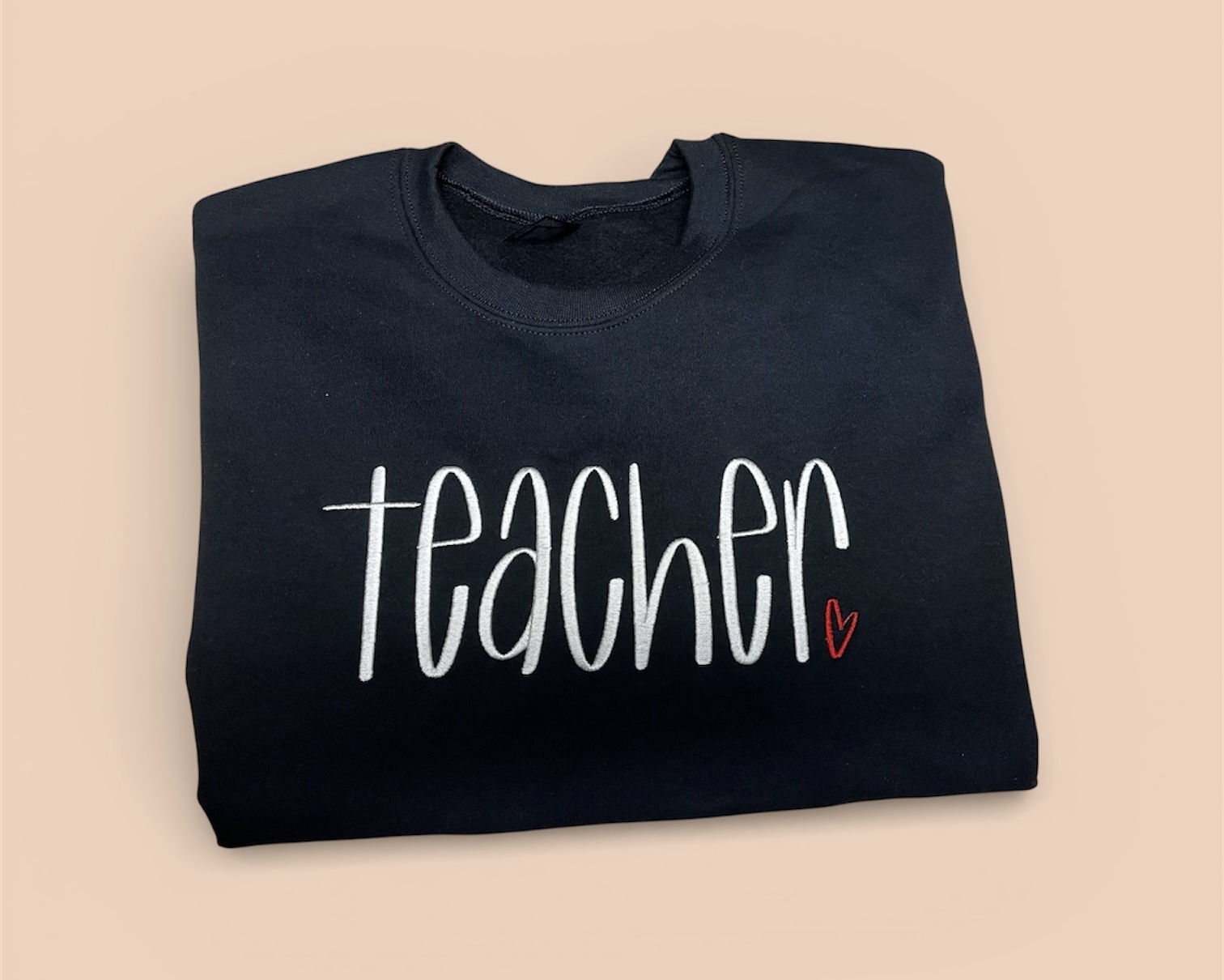 The embroidered design consist of Hand lettered font that reads TEACHER with a heart to the right.